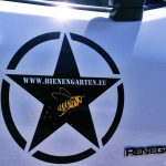 Um die Sache gänzlich abzurunden, habe ich meinem Imkermobil ein aussagekräftiges und dazu auch werbewirksames Dekor verpasst. Die Vordertüren werden von einem Stern mit imposanter Biene und Web-Adresse (www.bienengarten.eu) beflaggt. Und die Hintertüren werden von einem idyllischem Imker-Schatten-Bild geschmückt, auf dem u.a. auch mein Realschatten, das Wölfchen „Bakira“ zu sehen ist. ![]()