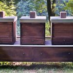 Gedacht – getan! Ich transportierte den Fund zu mir. Jetzt ging es an die Restauration. Eigentlich war nicht viel zu tun, den Korpus, die Schubladen, Füße etc. musste ich etwas richten, fixieren und neu verleimen. Zu guter Letzt bekam das Teil noch einen Schutz-Anstrich und ich konnte den neuen Bienenstand am ausgesuchten Platz mit Einschlaghülsen montieren.