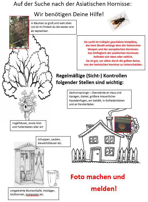 Da die invasive Asiatische Hornisse (Vespa velutina var. Nigrithorax), eine erhebliche Bedrohung für heimische Insekten wie Honigbienen und damit für die Biodiversität darstellt, ist es wichtig Maßnahmen zu ergreifen. Dabei kann jeder mithelfen, indem er Sichtungen meldet.