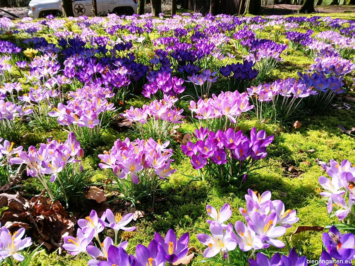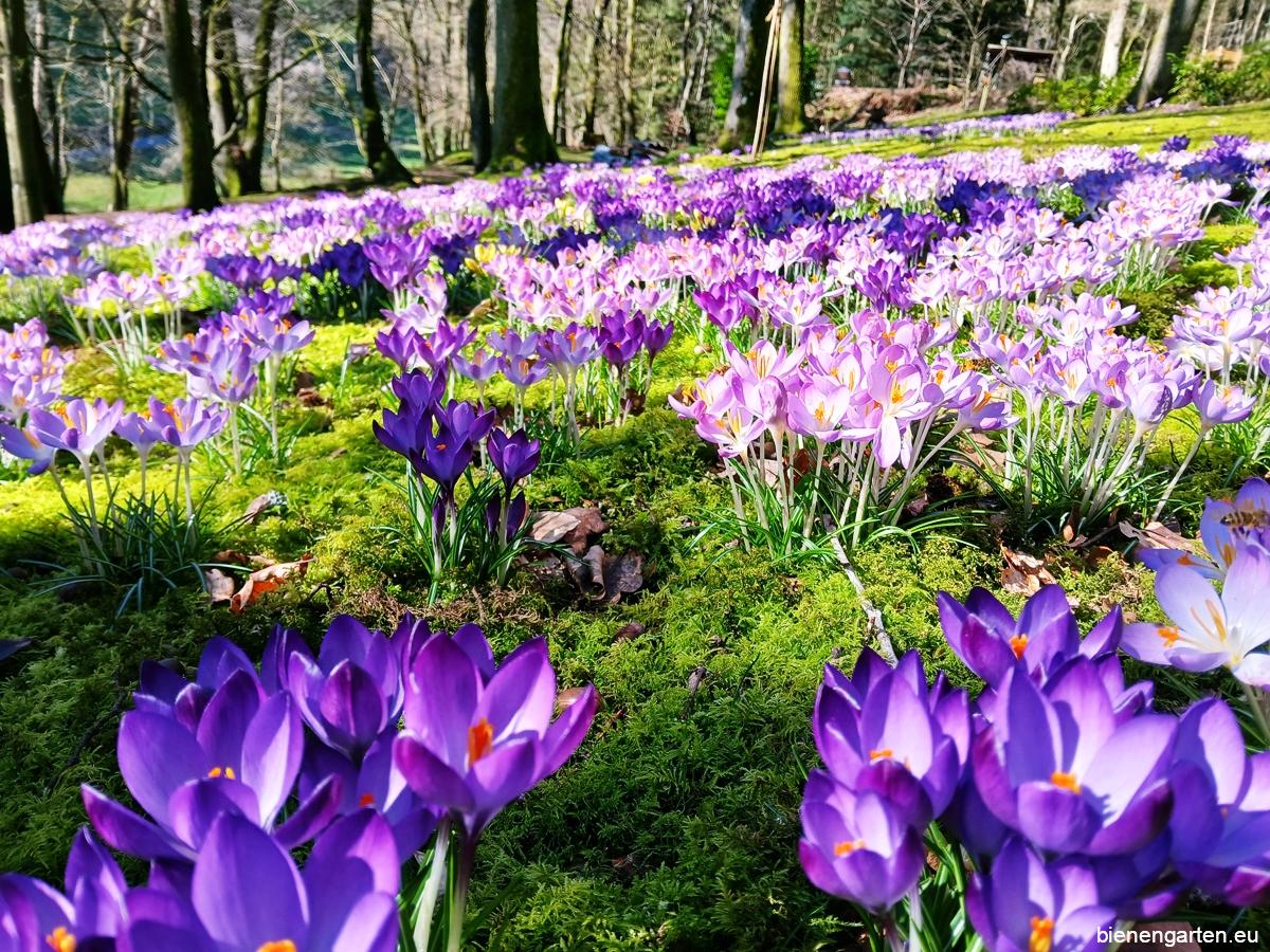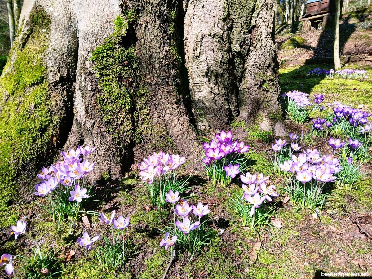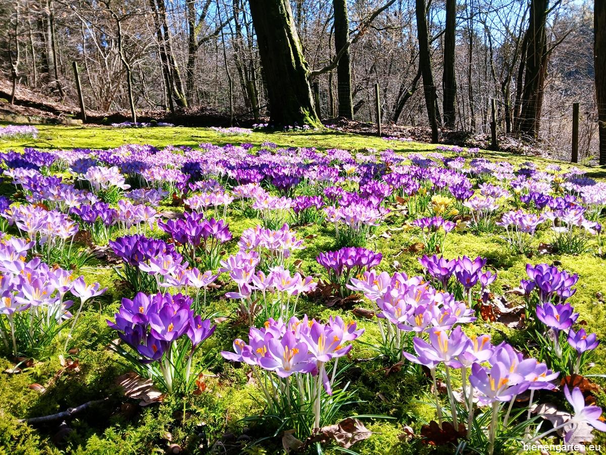 Am 25. Februar 2026 erwartete mich in meinem Bienengarten ein wunderbarer Anblick: Zwischen den noch winterlichen Farben des Waldes hatte sich über Nacht ein ganzes Meer aus blühenden Krokussen ausgebreitet. Wie kleine farbige Lichtpunkte leuchteten sie im Sonnenlicht und kündigte unübersehbar den nahenden Frühling an.